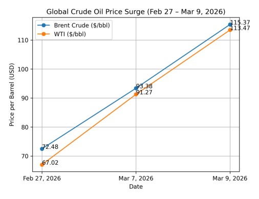 Global crude oil prices have surged dramatically, with Brent Crude rising above $115.37 per barrel as of Monday, March 9, 2026, up from $93.38/bbl recorded on Friday, March 7—representing a sharp increase of about 23.6 percent within a few days.